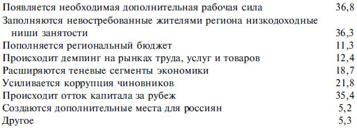 Согласно результатам опроса, 46,3 % респондентов полагают, что наличие трудовых иммигрантов в регионе обостряет напряженность на рынке труда и повышает безработицу среди местного населения. Естественно, так думают чаще безработное (58,8 %) и домохозяйки (57,1 %), чем работающее население (46,2 %).