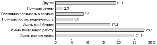 Некоторые респонденты считают, что мигранты должны иметь равные права с местным населением, иметь постоянную работу и возможность заниматься бизнесом. Вместе с тем лишь незначительная часть населения согласна с тем, чтобы мигранты покупали жилье, недвижимость, постоянно проживали в регионе и самое главное – приобретали землю (рис. 13.12).
