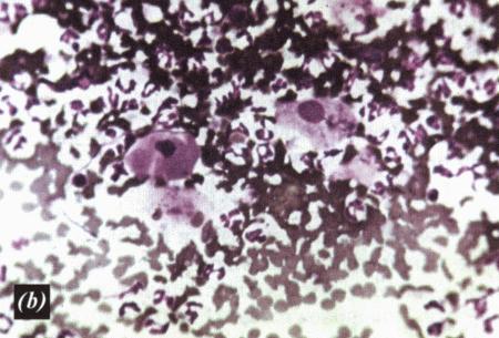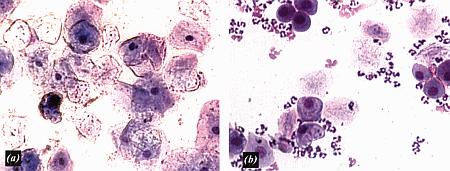 Вагинальные выделения кошки (а). Выделения, типичные для фазы эструса. Большая часть клеток представляет собой безъядерные кератинизированные клетки или клетки с пикнотическим ядром. Присутствуют промежуточные клетки (b). Выделения, характерные для метэструса, — «течки», иногда наблюдаемой у кошек в конце эструса. Присутствуют поверхностные и промежуточные клетки, повышено содержание белыми кровяными тельцами. Этот короткий метэструс наблюдается в течение 24–48 часов.