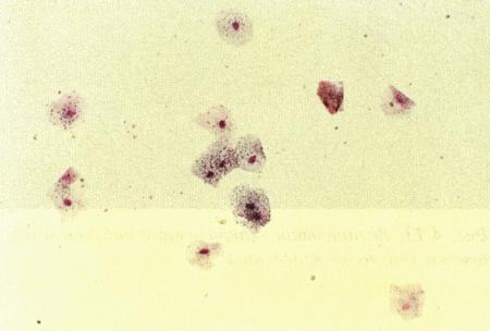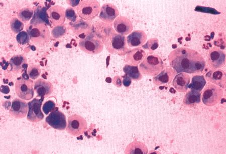 Дегенеративные эпителиальные клетки эндометрия в эндометриальном цитологическом образце, взятом у суки грейхаунда в период слушивания эндометрия после родов. Характерно, что многие клетки имеют пикнотические ядра и вакуолизированную цитоплазму (образец окрашен Diff-Quik®).