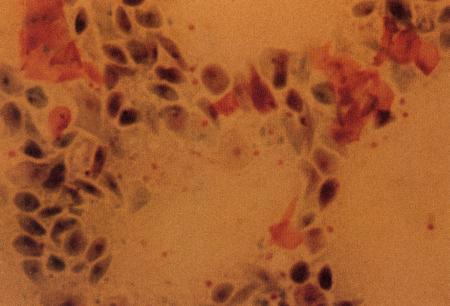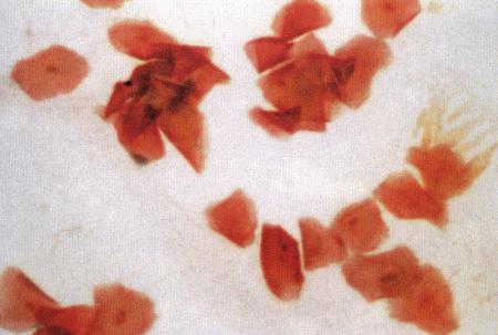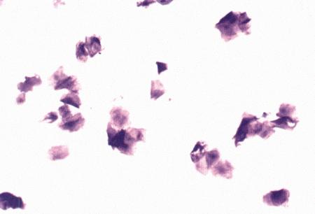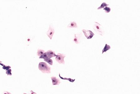 Поверхностные клетки в мазке вагинальных выделений у суки в период эструса (окрашивание мазка Schorr's trichrome).