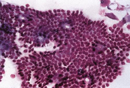 Большие скопления нормальных эпителиальных клеток эндометрия в эндометриальном цитологическом образце, взятом у суки грейхаунда в начале метэструса (образец окрашен Diff-Quik®) (Воспроизведено с разрешения из Journal of Small Animal Practice (1998) 39, 2–9).