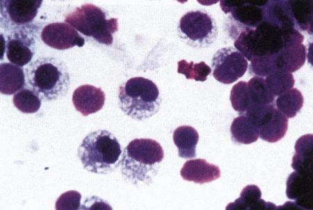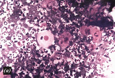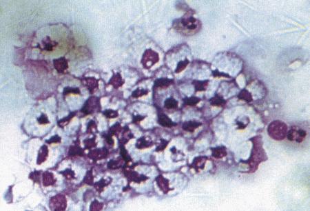 Вагинальная цитология при экстремально коротком проэструсе у суки. Мазок взят на 12-й день после начала проэструса. Повышение концентрации прогестерона в плазме в сочетании с большим количеством полиморфноядерных лейкоцитов указывает на овуляцию, произошедшую приблизительно на 6-й день после начала проэструса.