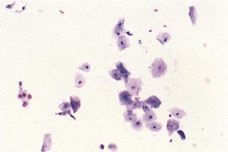 Вагинальная цитология суки с кистами яичников. Проэструс начался 34 дня назад. Выделения типичны для конца проэструса и содержат поверхностные клетки.