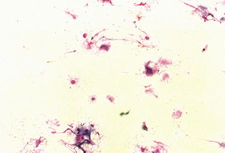 Вагинальная цитология 7-месячной суки с ювенильным вагинитом. Следует отметить большое количество полиморфноядерных лейкоцитов.