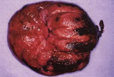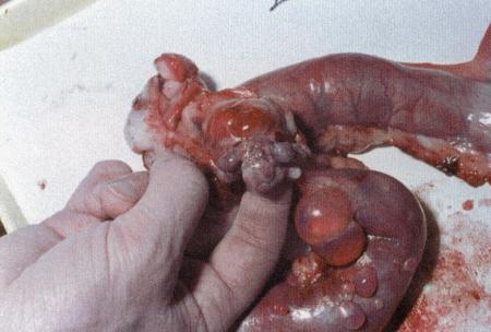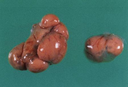Яичники суки при пиометре (около 6 недель после течки). Характерно отсутствие желтых тел.