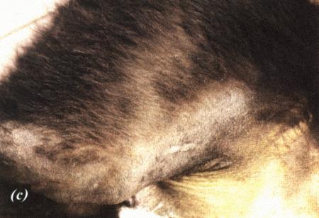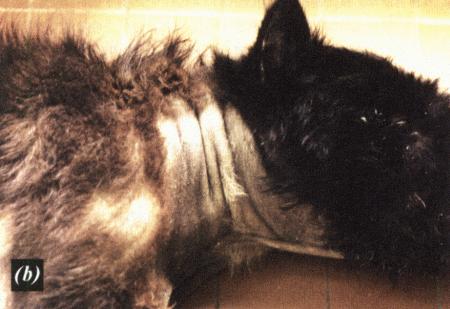 (а) опухоль семенника у кобеля крипторха; (b, с) дерматологические нарушения, обусловленные опухолью.