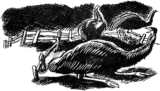 Карроинги как вожак большой стаи был всегда настороже и первым почуял опасность. Птицы щипали траву на площадке в одну-две квадратные мили. Среди них многие были сыновьями, дочерьми и внуками Карроинги. Изгородь была сломана в нескольких местах. Подняв голову, Карроинги вдруг увидел всадника, бесшумно приближавшегося к нему. За всадником по пятам неслышно бежала собака.