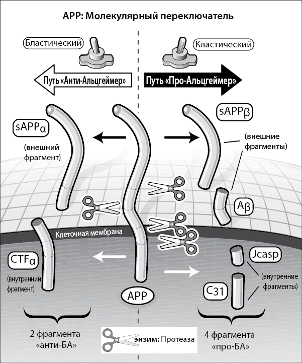 Рис. 3. Молекулярные ножницы могут разрезать APP в одном участке с последующим образованием двух анти-Альцгеймеровских фрагментов или в трех различных участках с последующим образованием четырех про-Альцгеймеровских фрагментов.