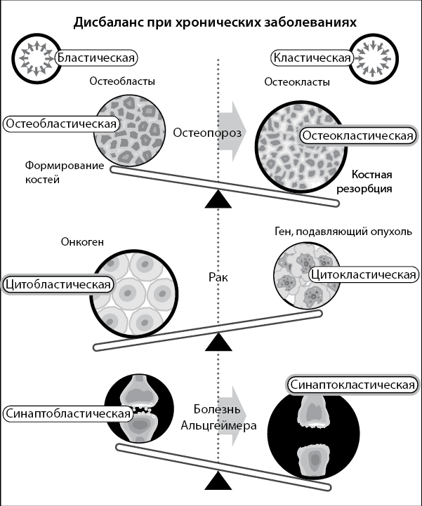 Рис. 4. Дисбаланс между бластической (выработка) и кластической (резорбция) сигнализацией является первопричиной таких заболеваний, как остеопороз, рак и болезнь Альцгеймера.