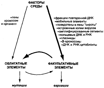 Рис. 26. Пути возникновения наследственных изменений в природе в системе «среда-факультативные-облигатмые элементы» (из: Голубовский, 2000).