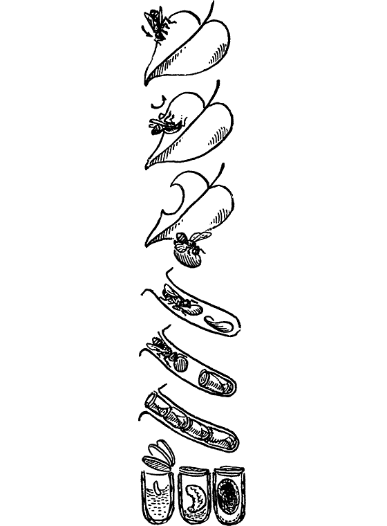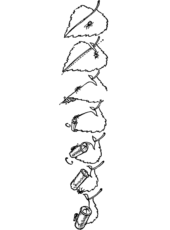 Кому не доводилось видеть летом на деревьях листья, свернутые в трубочку? Многие из них сооружены жучком-трубковертом аподером. Каждая трубочка представляет кров для потомства жучка. На рисунке (его следует рассматривать сверху вниз) показано, как аподер разрезает облюбованный им лист, как сгибает его вдоль длинной оси и как затем свертывает листовую пластинку в трубочку.