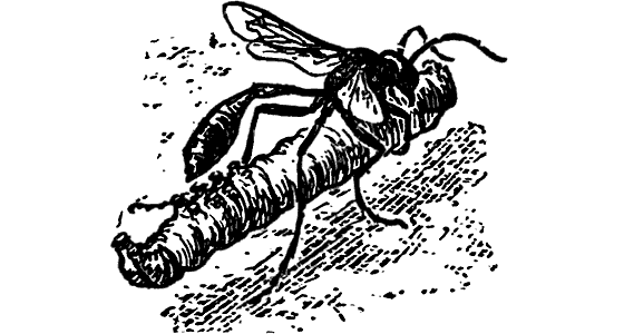 Оса аммофила, подробно изученная Ж-А. Фабром, несет в гнездо парализованную ею гусеницу.