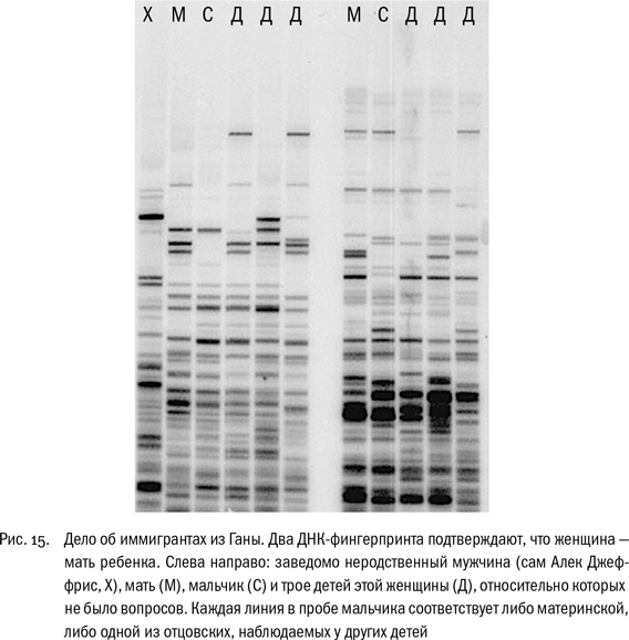 Летом 1985 г. ДНК-улики впервые фигурировали в суде – в деле об отцовстве. Проведенное вместе с госструктурами пилотное исследование по другим делам об иммиграции, преимущественно из Индии, доказало полезность ДНК-фингерпринта в тех случаях, когда нет надежных документальных подтверждений, – “и, кстати, продемонстрировало некоторые интересные расхождения между доказательствами, полученными с помощью ДНК, и решениями официальных лиц по оформлению въезда, которые проводили исследования родословных, беседовали со свидетелями в деревнях и т. п.”[19], пишет Джеффрис. Уже тогда наметилась эта проблема: ДНК-анализ знает чересчур много и нахально раскрывает семейные тайны.
