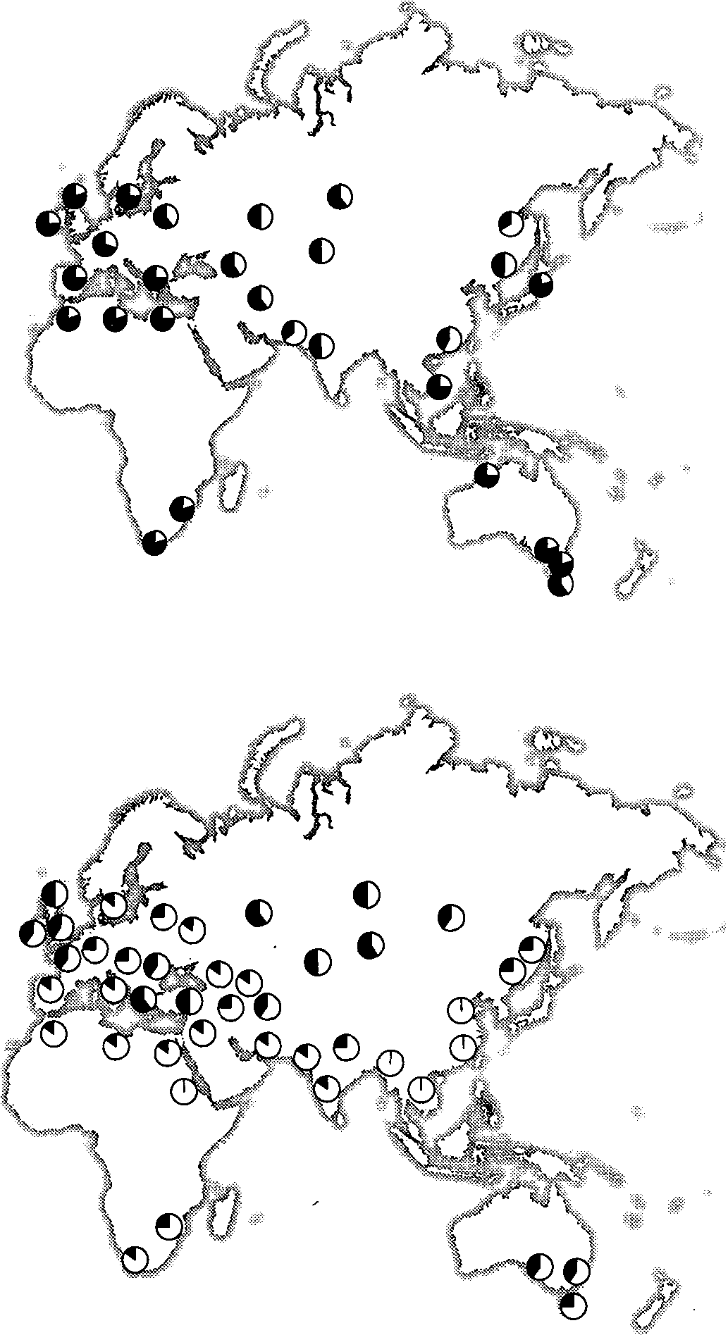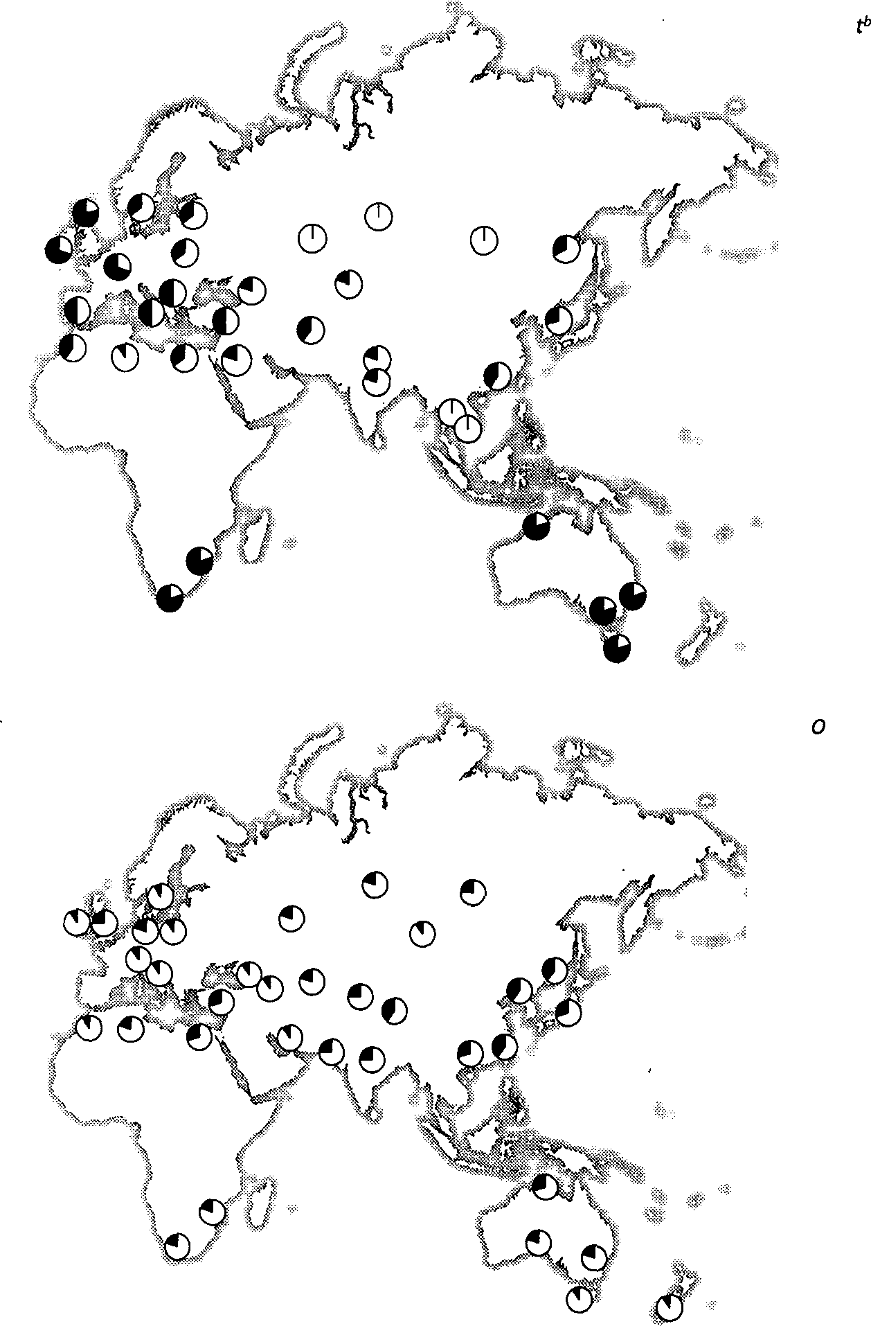 А сейчас рассмотрим внимательно карты распределения частот генов окраски по миру. Перейдем от микрогеографических различий между популяциями к макрогеографическим.