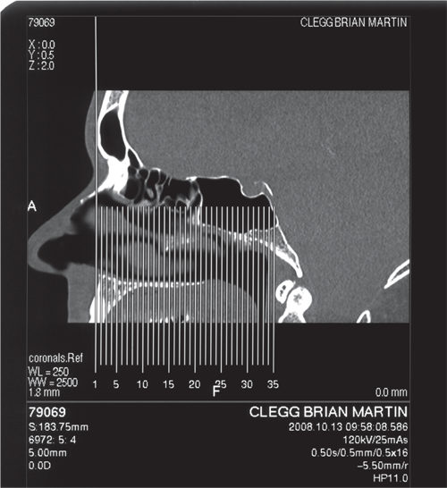 Снимок головы автора, сделанный с помощью компьютерной томографии. Вертикальные полоски отмечают отдельные слои, зафиксированные в томограмме