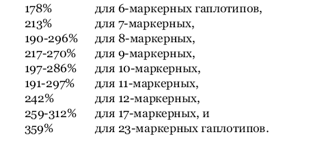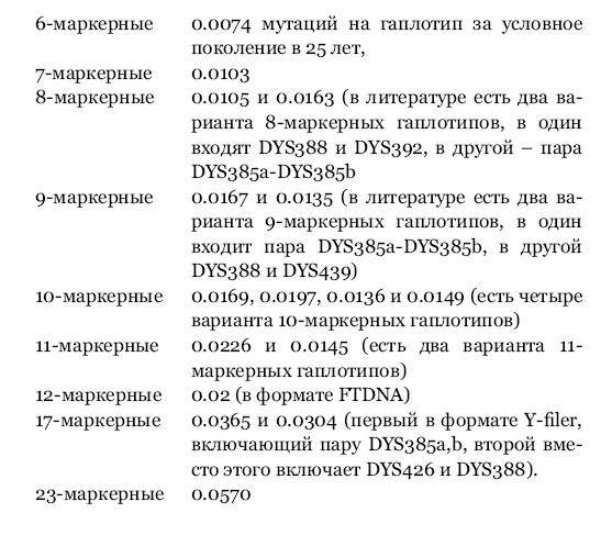 Давайте посмотрим, насколько промахиваются популяционные генетики, применяя свои «популяционные скорости». Как уже было сказано выше, для 6-, 7-, 8-, 9-, 10-, 11-, 12-, 17-, 23-маркерных гаплотипов (а с более протяженными популяционные генетики уже не работают, а если что-то и появилось в последнее время, то это как исключение) для попгенетиков константа скорости мутации для всех указанных гаплотипов равна 0.00069 на маркер на 25 лет, то есть для всех одинакова. В ДНК-генеалогии, однако, для указанных типов гаплотипов общая (то есть кумулятивная) константа скорости мутации равна:
