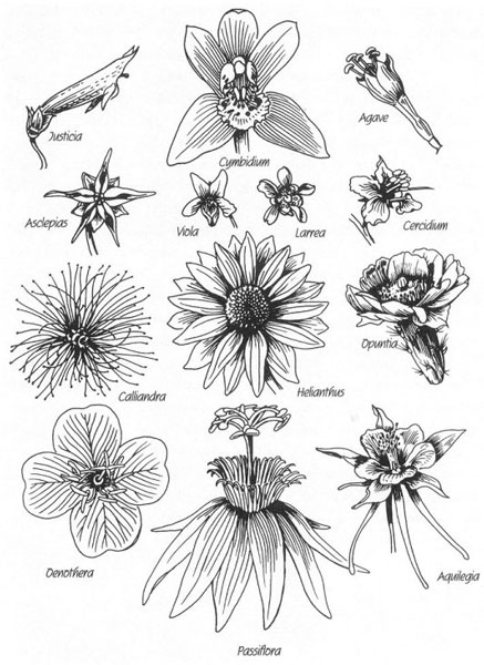 Цветы предлагают своим опылителям множество поразительно разнообразных форм, красок и ароматов, призванных привлечь их к спрятанному вознаграждению. Здесь изображено 13 видов устройства выбранных произвольно цветков, призванных иллюстрировать огромное богатство их форм.