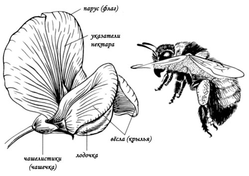 Шмель (Bombus sp.) собирается посетить двусторонне-симметричный цветок гороха посевного (Pisum sativum).