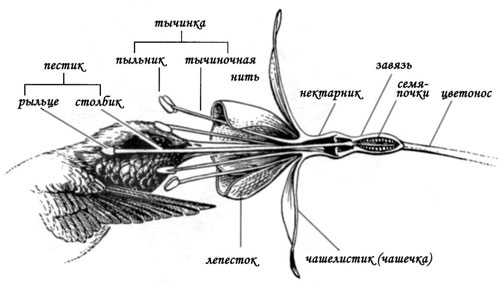 Части цветка показаны на этом опыляемом колибри цветке фуксии (Fuchsia sp.). Хотя цветы чрезвычайно изменчивы по размерам и форме, они все обладают этими основными частями, которые сформовались путём естественного отбора благодаря животным или абиотическим факторам, осуществляющим их опыление.