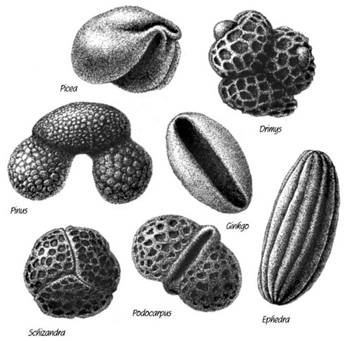 Увеличенные пыльцевые зёрна разнообразных цветковых и хвойных растений, демонстрирующие большое разнообразие в размерах и скульптуре поверхности.