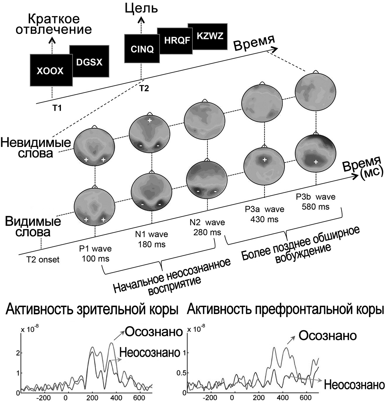 Записи, сделанные с помощью аппаратуры, показывали, что мозг перестраивался внезапно и очень быстро, вдруг начинал видеть и осознавать невидимое. В самом начале, в первичной зрительной области, уровень активности был одинаков независимо от того, было слово видимым или невидимым. Как и любые зрительные стимулы, осознаваемые и неосознаваемые слова провоцировали появление в задней части зрительной коры сплошного потока мозговых волн. Эти волны называются Р1 и N1 — то есть первая обладает положительным потенциалом, и между пиками проходит около 100 миллисекунд, а у второй потенциал отрицательный, и максимума она достигает за 170 миллисекунд. Обе этих волны отражают продвижение зрительной информации от первичных зрительных областей к высшим, причем, похоже, на начальном этапе продвижение абсолютно не связано с сознанием. Может участник назвать слово или нет — активность мозга равно выражена и интенсивна. Итак, в зрительную кору слово поступает независимо от того, может потом участник его назвать или нет.