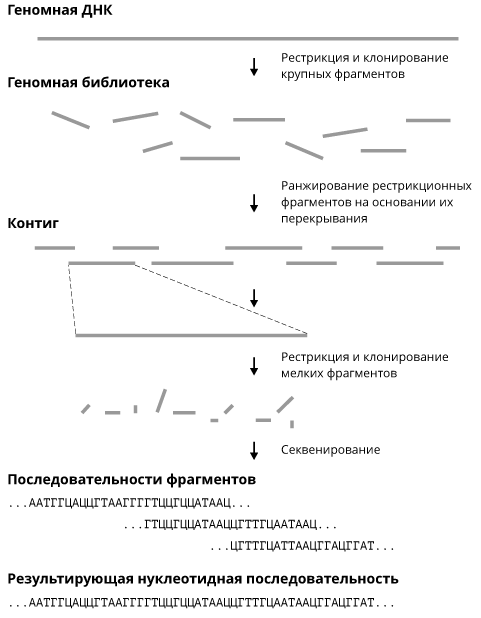 А далее наступила очередь секвенирования отдельных рестрикционных фрагментов. Это привело в конечном итоге к построению секвенсовых карт, на которых степень разрешения была доведена до своего максимального значения. Если 20 лет назад расшифровка нуклеотидной последовательности ДНК длиной 1000 п. н. считалась большим научным достижением (за это можно было сразу получить степень доктора наук), то уже к 1990 году секвенирование ДНК стало массовой технологией. А сейчас квалифицированный лаборант проделывает такую работу всего за несколько часов.