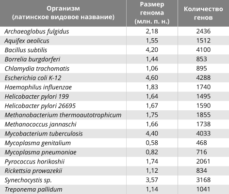 В конце 80-х гг. были начаты крупные международные проекты, целью которых было полное секвенирование геномов бактерий, грибов, дрожжей, дрозофилы, мыши, пшеницы, человека и др. Первоначально была определена первичная структура ДНК микроорганизмов с размерами генома до 20 млн. п. н., к концу 1998 г. их число составило уже 18 (см. табл. 2). Наименьший размер генома у свободно живущих организмов (например, у бактерии Mycoplasma genitalium) составляет лишь около 600 000 п. н. У этой бактерии содержится всего 500 генов, причем 150 из них (если их удалять по одиночке) никак не влияют на её жизнеспособность. Так возникло предположение, что элементарная «машина жизни» теоретически должна работать при наличии всего лишь 350 генов.