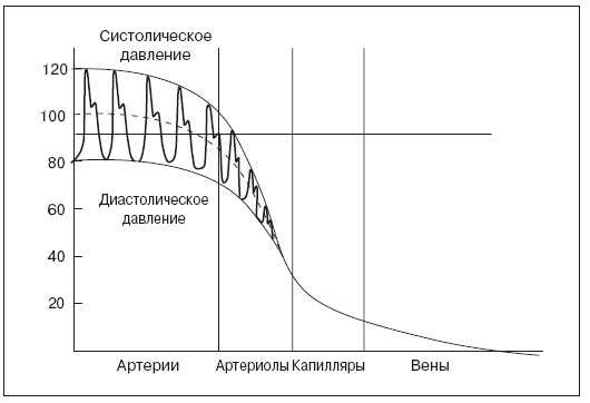 Рис. 20. Изменение кровяного давления в разных частях сосудистого русла