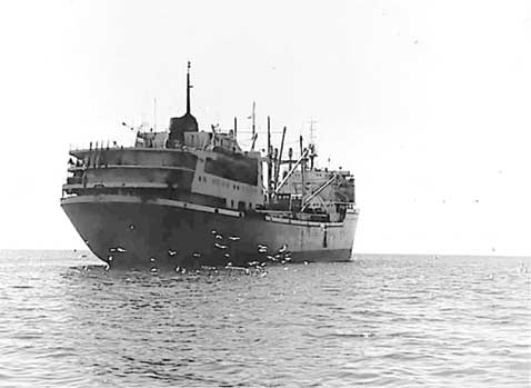 …У борта «Маршала Соколовского» в горячие дни путины снуёт мотобот, принимая улов траулеров, мощным серебристым потоком льётся рыба в приёмные бункеры, бесконечно движется конвейер, заполняя банки, только-только соскользнувшие с транспортёра.