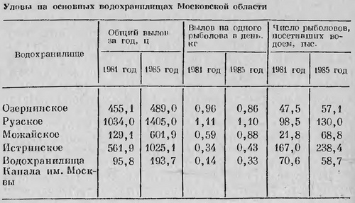 По наблюдениям ихтиологической службы Мосрыбвода уловы любителей возрастают наряду с неуклонным ростом численности посещающих водоемы рыболовов. В качестве примера можно привести состояние уловов на основных водохранилищах.