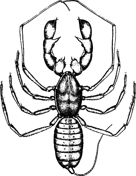 Быстро бегают телифоны (рис. 3) — крупные паукообразные до 75 мм длиной с твердыми темноокрашенными покровами. Передвигаются телифоны на трех парах ног, выставив вперед педипальпы и длинные передние ноги. Педипальпы — вторая пара конечностей — у телифонов очень крупные, хватательные, а их концевые членики заострены и образуют с предыдущими подобие клешней. Своеобразным средством защиты телифонов от врагов служат едкие выделения анальных желез. Защищаясь, телифон поднимает длинную хвостовую нить и с силой выбрасывает секрет в воздух. При попадании в глаза человека он может вызвать сильное раздражение.
