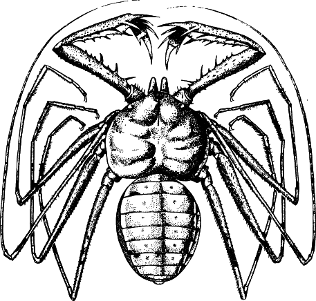 Телифоны живут только в тропических странах. Тропиками ограничивается распространение и представителей другого отряда паукообразных — фринов, или жгутоногих пауков (рис. 4). Своим видом фрины нередко приводят людей в ужас, если они не знакомы с этими безобидными животными. Несмотря на близость к паукам, фрины не имеют ядовитых и даже паутинных желез. Когда камень, под которым прячется фрин, поднят и тот оказывается на ярком свету, он сразу замирает, распластавшись на субстрате. Но стоит его тронуть — поспешно убегает, передвигаясь вкось и вбок, как краб. Передними длинными ногами фрин ощупывает дорогу по направлению движения. Педипальпы у фринов, как у телифонов, крупные, хватательные, вооружены шипами, а их концевые членики когтевидные.