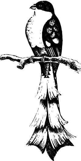 Не менее яркой переливающейся расцветкой обладает птица токолоро (Priotelus temnurus, рис. 8), относящаяся к тропическому семейству трогонов. Грудь, горло и подхвостье у нее белые, брюхо красное. Голова голубого цвета, а оперение спины переливается голубым, зеленым и бронзовым. Верхние кроющие перья крыльев и надхвостье черные с белыми пятнами. Несмотря на экзотическую яркость расцветки, заметить птиц крайне трудно, так как они имеют обыкновение подолгу сидеть на ветке совершенно неподвижно. При этом тело располагается вертикально, длинный хвост свешивается вниз, и токолоро удачно вписывается в ландшафт саванного болота.