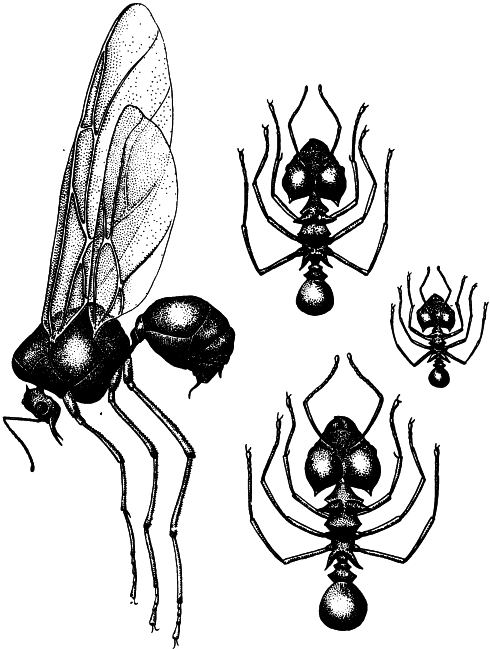 Среди кубинских муравьев в наибольшей степени полиморфизм стерильной касты выражен у рода Pheidole (рис. 11). Один из обычных здесь видов интересен тем, что голова его солдат очень велика, что нашло отражение в видовом названии: Ph. megalocephala — феидоле большеголовый. У всех видов данного рода размеры особей, относящихся к различным группам стерильной касты, существенно различаются, и это отражается на их морфологии. Наиболее крупные особи — солдаты — имеют очень крупную голову почти квадратной формы с мощными челюстями, несущими два зубчика. У ряда видов имеются все промежуточные формы между рабочими и солдатами, но у других видов они отсутствуют. В последнем случае наблюдается четкий диморфизм стерильной касты — имеются только рабочие муравьи и солдаты. Функции рабочих и солдат разные. Для солдат это прежде всего защита гнезда и доставка в гнездо добычи, которую они обязаны и расчленить, рабочие же выполняют хозяйственные работы внутри гнезда и выкармливают личинок.