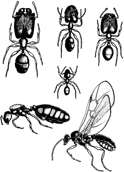 Рис. 10. Муравьи-листорезы: крылатая особь и рабочие.
