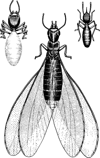 Рис. 13. Термиты Nasutitermes costalis: крылатая особь, рабочий (слева) и солдат.