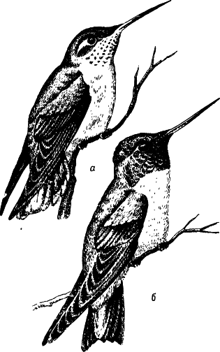 Рис. 15. Птица-муха — Calypte helenae: самка (а) и самец (б).