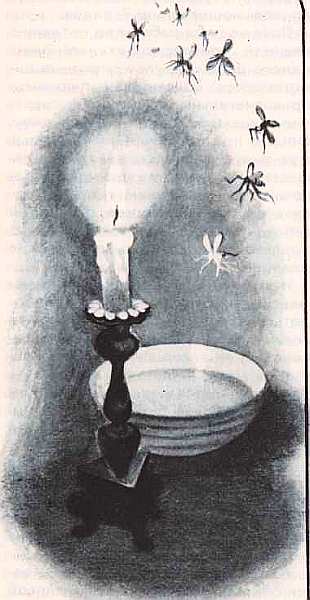 А канадский биолог Райт предложил простой и эффективный способ борьбы с комарами, исходя из их удивительной запахочувствительности. Он придумал ловушку, состоящую из ванночки с водой и горящей свечи. Комаров, как мы уже говорили, привлекает влага, тепло и углекислый газ. Влага — это нагретая вода; тепло и углекислый газ дает горящая свеча. Комары на эту приманку летят издалека. И тут с ними можно делать что угодно — травить или механически истреблять.