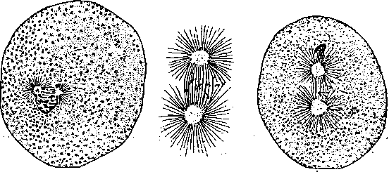 На левом рисунке маленький пронуклеус сперматозоида виден при правой центросоме; на правом рисунке — при верхней центросоме. На правом и среднем рисунке видно гаплоидное число хромосом.