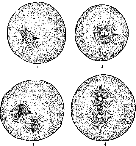 Приблизительно через полчаса от начала опыта можно видеть проникшие сперматозоиды в виде больших, сильно преломляющих свет телец в протоплазме яйца. Через 10–20 минут возле такого тельца возникает отчетливое сияние, лучистая сфера. Лучистая сфера сперматозоида, проникшего первым (часто также и второго и третьего), начинает правильно, хотя и медленно, двигаться к ядру яйца, ведя за собой и ядро (пронуклеус) спермия. (Сперматозоиды, проникшие позднее, также образуют сферы, но остаются на периферии и могут не поворачиваться сферой к ядру яйца.) Далее образуется уже центральное слияние, и оболочка ядра яйца исчезает, начинается первое дробление. Нередко это центральное слияние захватывает и другие сперматозоиды, — образуется многополюсный митоз, и яйцо гибнет.