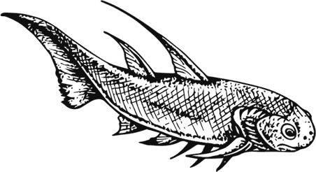 Пережили свой расцвет и закат бесчелюстные. Особенно много их было в начале периода, но к началу среднего девона большинство вымерло, так что в позднем девоне они уже были очень редки. Телодонты вообще немногочисленны и представлены частично теми же родами, что были и в конце силура – Thelodus и Turinia pagei. Забавно выглядели пятиугольные, сплющенные с боков Furcacauda, у которых половину длины занимал хвост из двух одинаковых остей с перепонкой посреди.