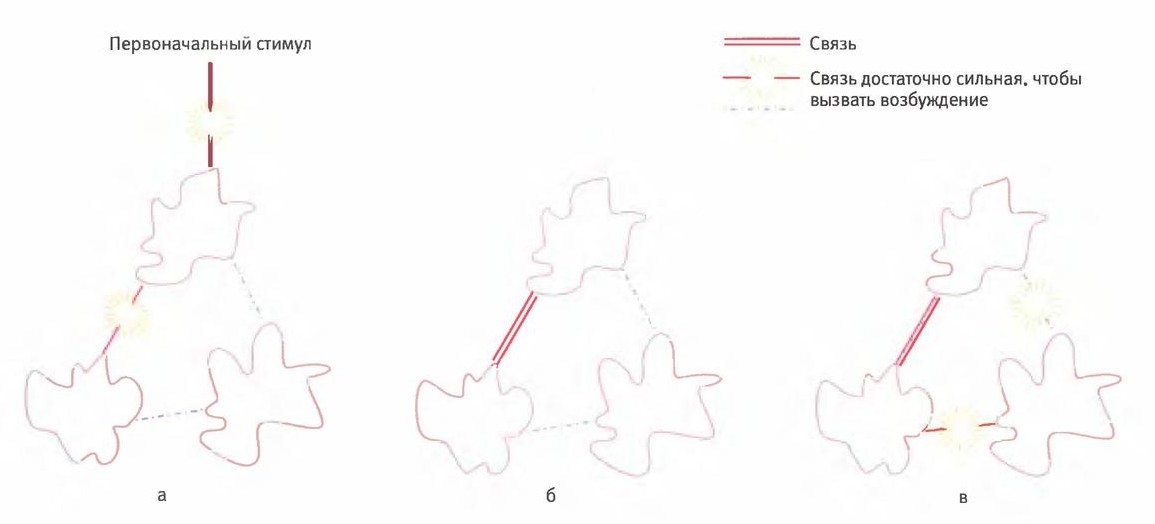 Это делает клетку №2 более чувствительной к возбуждению со стороны клетки №1. Клетка №2 остается в таком состоянии (как бы поставленной на паузу) несколько часов или дней, б) Если в течение этого периода клетка №1 вновь возбуждается, даже слабого ее возбуждения оказывается достаточно, чтобы вызвать возбуждение в клетке №2. С каждым разом, когда эти две клетки возбуждаются одновременно, связь между ними усиливается. В итоге они могут оказаться связаны навсегда, так что возбуждение первой неизменно вызывает возбуждение второй, в) Когда клетки №№1 и 2 возбуждаются одновременно, их совместного возбуждения оказывается достаточно, чтобы возбудить другие, даже слабо связанные с ними клетки. Если это происходит неоднократно, то все вместе они образуют устойчивую конфигурацию активности — воспоминание.