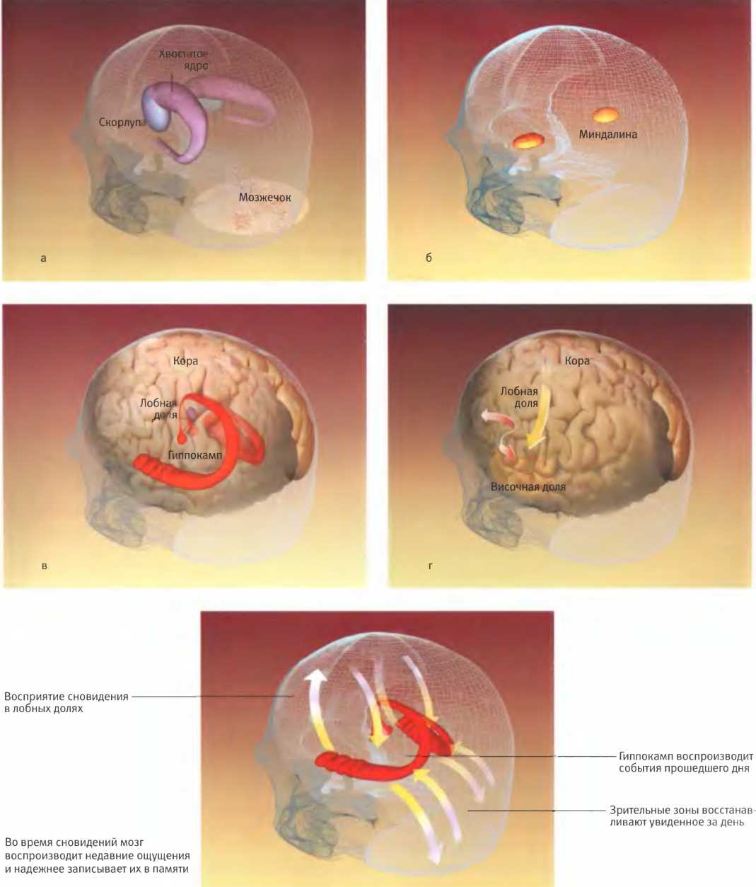 Ощущения, которым суждено быть записанными в долговременной памяти, передаются в гиппокамп, где они остаются на хранении в течение двух-трех лет. За это время гиппокамп неоднократно воспроизводит такие воспоминания, активируя кору больших полушарий, откуда они и поступили, и каждое такое воспроизведение приводит к более надежному закреплению воспоминаний в коре. В конечном счете они оказываются надежно записаны в коре, и нужда в гиппокампе для их считывания может отпасть. Значительная часть воспроизведения воспоминаний гиппокампом, судя по всему, происходит во сне. Наши сны во многом состоят как раз из повторного воспроизведения событий прошедшего дня за счет сигналов, которые гиппокамп посылает в кору больших полушарий.