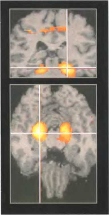 Активность в мозге человека, который смотрит фильм о том, как некто идет по городу, хорошо знакомому испытуемому. Светящаяся область — гиппокамп.