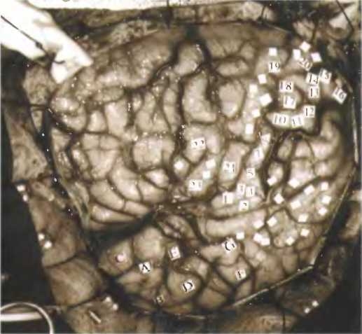 Канадский нейрохирург Уайлдер Пенфилд идентифицировал участки мозга, ответственные за воспоминания, стимулируя кору больших полушарий во время операций на головном мозге пациентов, страдавших эпилепсией. Пациент при этом оставался в сознании. Номерами отмечены места, стимуляция которых вызывала воспоминания.