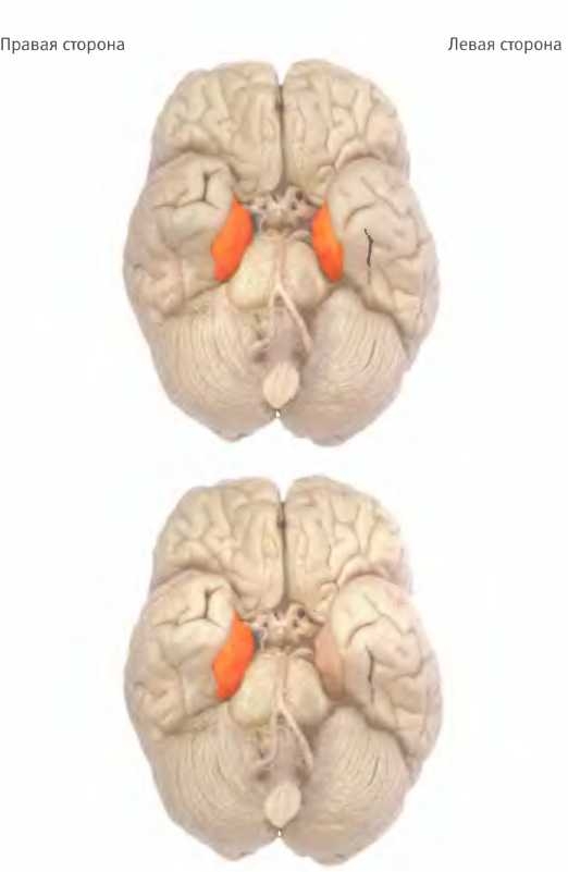 При ориентировании на знакомой местности гиппокамп тоже активируется, но только в правом полушарии (внизу).