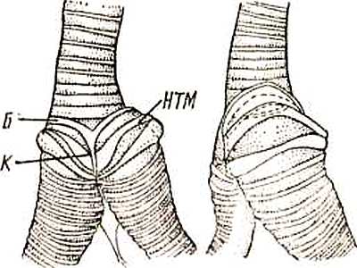 Рис. 2. Нижняя гортань птиц (крикс) (по: Chamberlain et al., 1968) Б — бронхи; К — козелок; НТМ — наружная тимпанальная мембрана