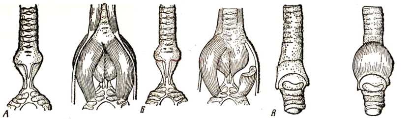 Рис, 3. Нижняя гортань волнистого попугайчика А — вентральная сторона; Б — дорзальная; В — латеральная (Evans, 1969)