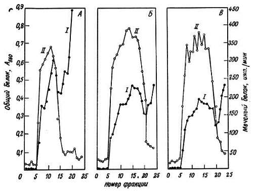 Рис. 5.8. Полученный с помощью хроматографии на сефадексе G-25-80 профиль элюции меченого белка (комплекс 3Н-эстрадиол — белок) (I) и всего белка (II). Цитозоль полушария мозга крыс в возрасте 7 нед после овариэктомии (А), 44 нед (Б) и 108 нед (В) [30]